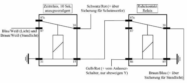 Allerdings habe ich mir, um die Batterie zu schonen, etwas Besonderes ausgedacht. Ich benutze ein Zeitrelais mit einer Verzögerung von 10 Sekunden und ein Ruhekontaktrelais. Das Zeitrelais ist für das verzögerte Einschalten des Lichtes und das Ruhekontaktrelais ist für die Unterbrechung des Arbeitsstroms am Zeitrelais während des Anlassvorganges nötig.